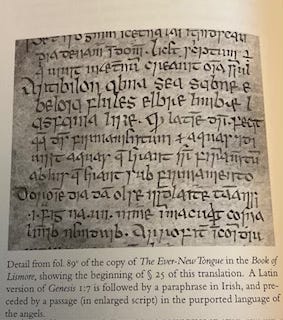 The text composed in the 9th or 10th centuries in Ireland is a cosmological revelation, ostensibly delivered by the soul of the Apostle Philip to an assembly of Eastern kings and bishops on Mount Zion. Philip descends in a bolt of spinning light. He speaks. And what he speaks, for selected passages throughout the text, is in a language no one on earth recognises — because no one on earth invented it except the anonymous Irish author writing it down. This post is about this seemingly invented language: what it looks like, what we can say about its structure, and what it tells us about the extraordinary imagination of early Irish religious writing.
